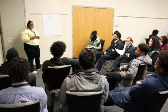 The Summit included nearly 250 high school students enrolled in teacher pathway programs from nine district and charter schools—Boys’ Latin of Philadelphia Charter School, El Centro Big Picture High School, Esperanza Academy Charter School, Imhotep Institute Charter High School, Mastery Charter School Lenfest, Olney High School, Parkway West High School, Science Leadership Academy (SLA) @ Beeber, and Vaux Big Picture High School.